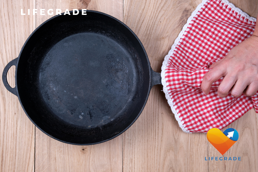 세척 후에는 반드시 오일을 얇게 발라 주물냄비의 상태를 유지해야 합니다. 따뜻한 냄비에 15-30ml의 오일을 붓고 키친타올로 균일하게 펴 발라 주세요. 이때, 오일이 냄비 표면과 반응하여 중합체를 형성해, 다음 사용 시 눌어붙지 않도록 도와줍니다.